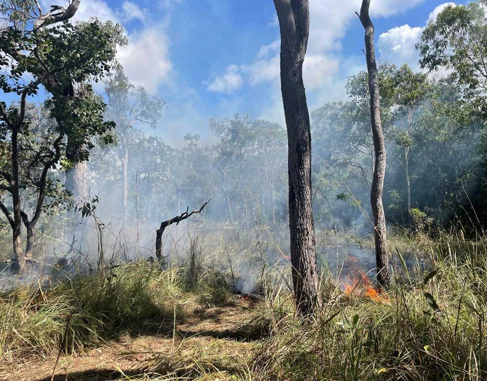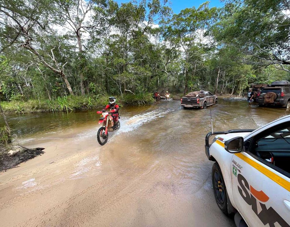 Wyjazd z wodnej kawiarenki jest dosyć stromy, ale wszystkim udaje się go pokonać. Tak jak i następną wartką rzekę. Przejeżdżamy ją w najpłytszym miejscu po płaskich kamieniach. Kilkanascie centymetrów w bok widać niebezpieczną głębię. Jedziemy dalej. Nad nami warkot helikoptera. Obok pali się las. To kontrolowane wypalanie buszu. Z helikoptera spadają race, które podpalają busz. Jest to tzw. ogień niskiej temperatury. Po wypaleniu ściółki i traw, ogień wygasa, a las odradza się błyskawicznie. Tym razem natrafiamy na wyjątkowo trudny kawałek drogi.