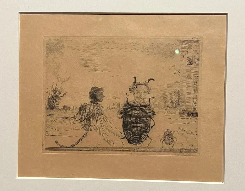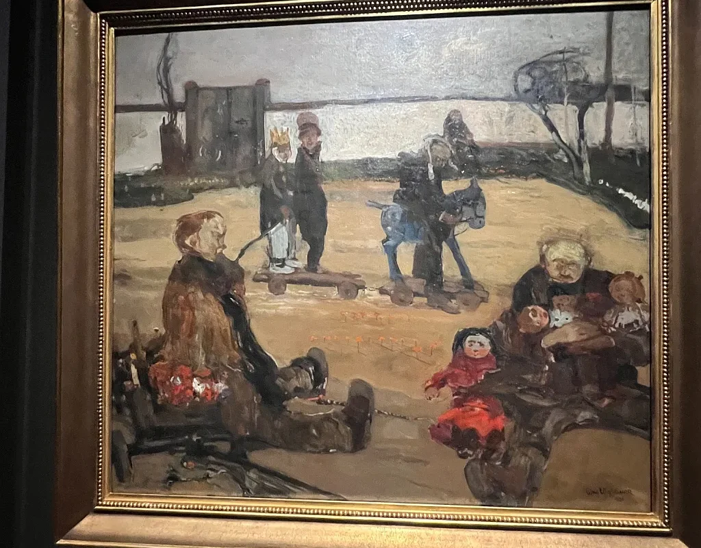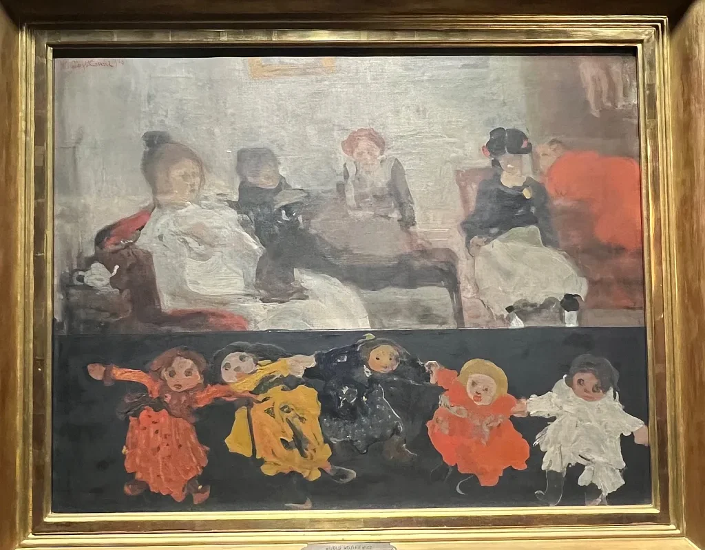 James Ensor (1860–1949), belgijski mistrz groteski, i Witold Wojtkiewicz (1879–1909), wizjoner Młodej Polski, dzielą wspólną wrażliwość: niepokój wobec świata, fascynację maską, śmiercią i teatrem życia. Ensor, zakorzeniony w folklorze Ostendy, malował wizje karnawałowego szaleństwa, pełne masek, parad i barwnego chaosu. Przekornie i dosadnie piętnował obłudę i głupotę. Operował ostrymi kolorami i deformacją postaci. Bardziej liryczny Wojtkiewicz tworzył melancholijne obrazy dzieciństwa, szaleństwa i śmierci, gdzie niewinność spotyka się ze stratą i kruchością istnienia. Jego postaci to ożywione lalki, istoty na granicy jawy i snu, wyobcowane, często wykluczone. Obaj pokazują świat na opak – zarazem absurdalny i boleśnie prawdziwy”, opowiadała kuratorka Joanna Kilian.