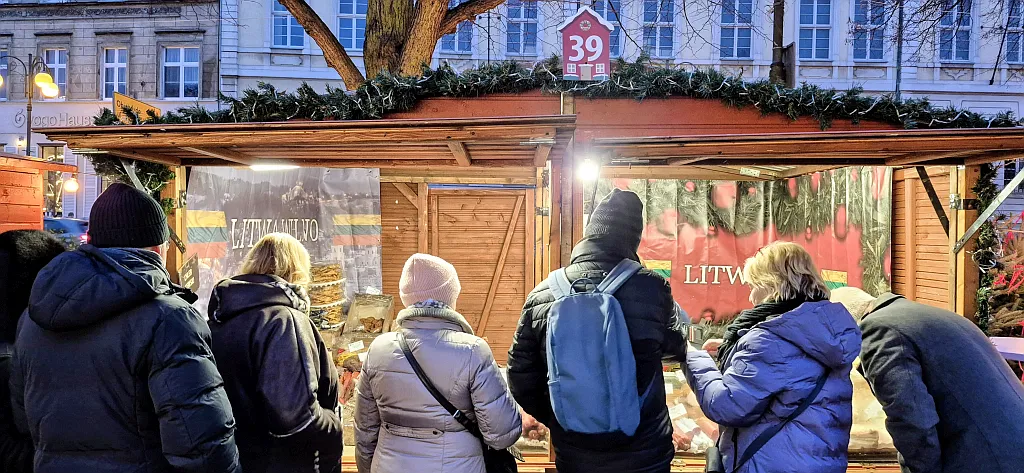 Chleb litewski wyróżnia się głęboką, lekko kwaskową nutą, ciemnym kolorem i intensywnym aromatem kminku. Wypiekany jest na naturalnym zakwasie, często z dodatkiem miodu lub melasy, co nadaje mu charakterystyczny posmak. Wiele osób przyznaje, że kupuje go hurtowo – po dwa lub trzy bochenki – ponieważ długo zachowuje świeżość i jest znakomitą bazą do świątecznych potraw. Z kolei wileńskie wędliny – kindziuk, sucha kiełbasa, szynka dojrzewająca, polędwica z czosnkiem i tradycyjny słoninowy skilandis – zachwycają głębokim aromatem dymu i przypraw naturalnych. Ich wyjątkowy smak wynika z powolnego dojrzewania i wykorzystania mięsa wysokiej jakości. Stoisko litewskie jest łatwe do odnalezienia: przed nim niemal zawsze ustawia się kolejka, a charakterystyczny zapach wędzonki unosi się już z kilku metrów.