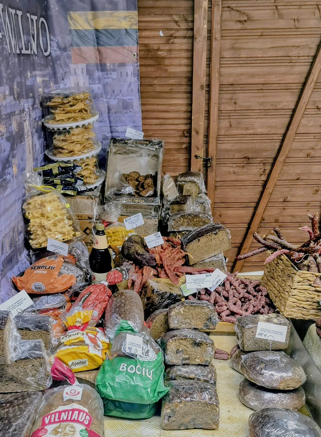 Chleb litewski wyróżnia się głęboką, lekko kwaskową nutą, ciemnym kolorem i intensywnym aromatem kminku. Wypiekany jest na naturalnym zakwasie, często z dodatkiem miodu lub melasy, co nadaje mu charakterystyczny posmak. Wiele osób przyznaje, że kupuje go hurtowo – po dwa lub trzy bochenki – ponieważ długo zachowuje świeżość i jest znakomitą bazą do świątecznych potraw. Z kolei wileńskie wędliny – kindziuk, sucha kiełbasa, szynka dojrzewająca, polędwica z czosnkiem i tradycyjny słoninowy skilandis – zachwycają głębokim aromatem dymu i przypraw naturalnych. Ich wyjątkowy smak wynika z powolnego dojrzewania i wykorzystania mięsa wysokiej jakości. Stoisko litewskie jest łatwe do odnalezienia: przed nim niemal zawsze ustawia się kolejka, a charakterystyczny zapach wędzonki unosi się już z kilku metrów.