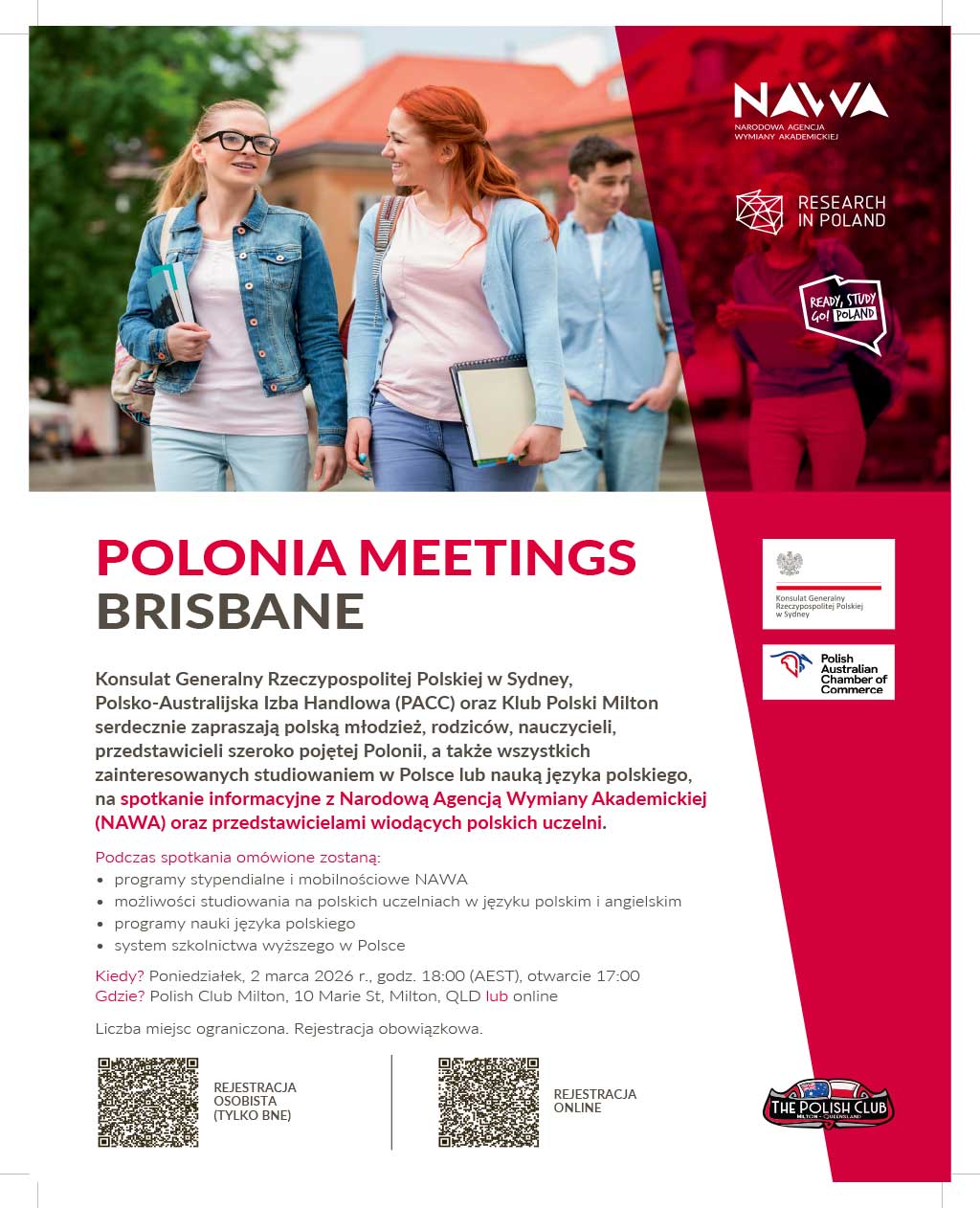 Spotkanie informacyjne dla Polonii zostanie zorganizowane także w Brisbane w dniu 2 marca 2026. Więcej informacji oraz sposób rejestracji uczestników na stronie: NAWA – Polonia meetings w Sydney i Brisbane – Polska w Australii – Portal Gov.pl
