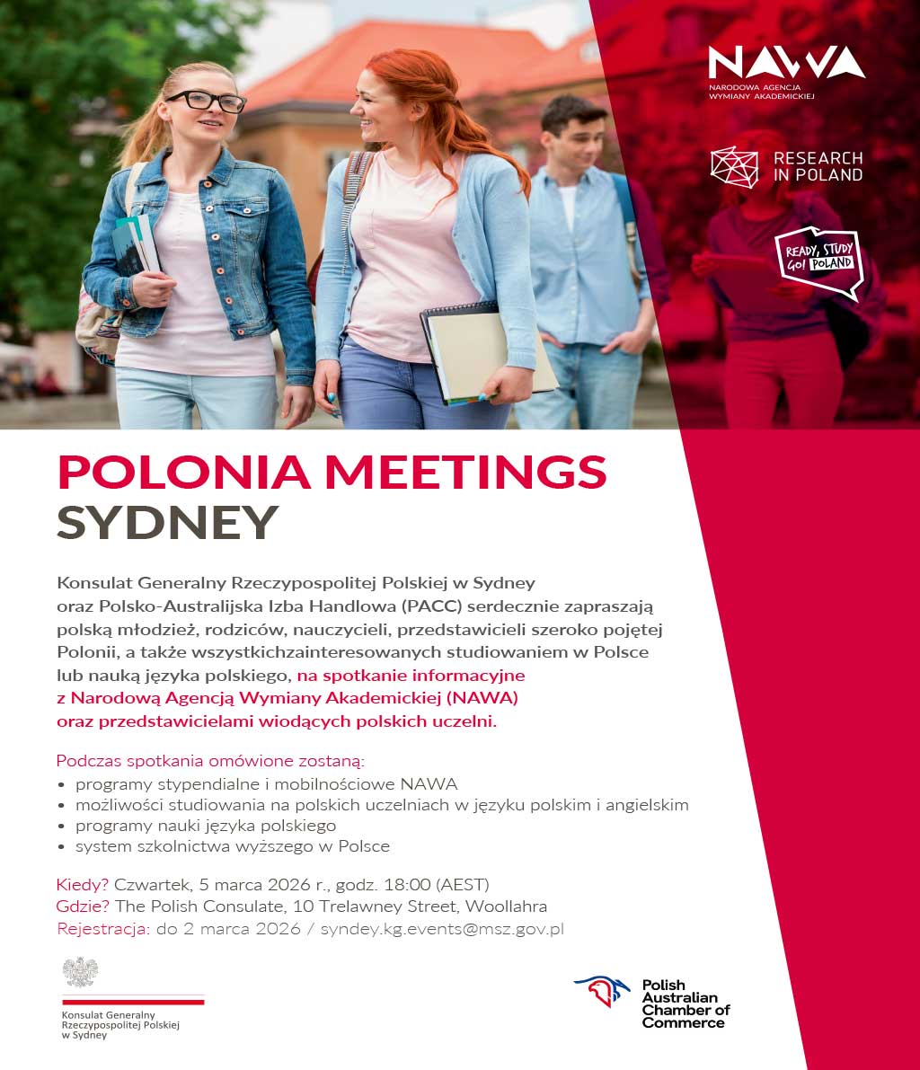 Konsulat Generalny Rzeczypospolitej w Sydney wraz z Polsko-Australijską Izbą Handlową (PACC) zapraszają uczniów polskiego pochodzenia oraz ich rodziców, a także nauczycieli na spotkanie informacyjne z przedstawicielami Narodowej Agencji Wymiany Akademickiej.