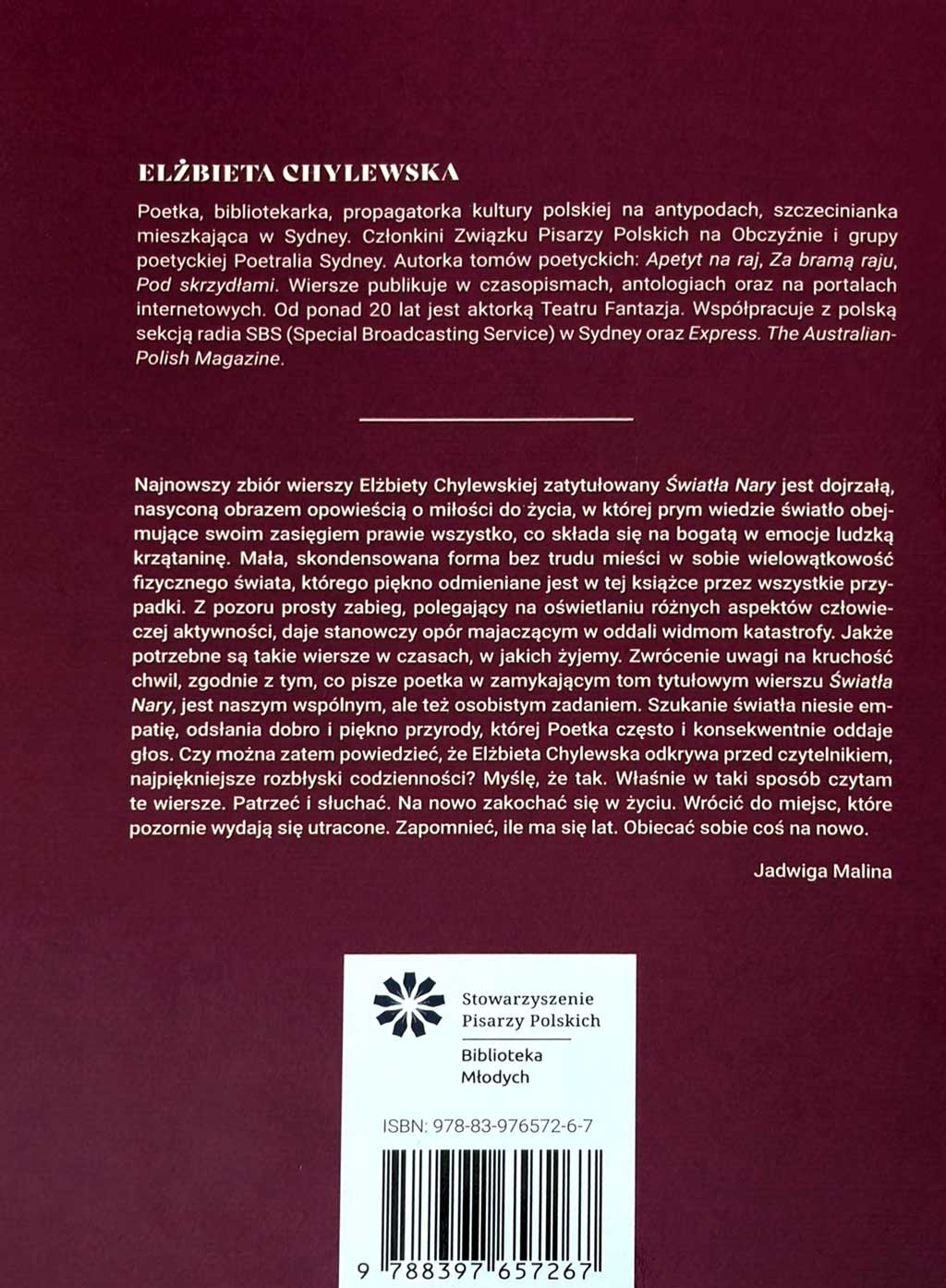 Elżbieta Chylewska, szczecińska poetka od dawna mieszkająca na stałe w Australii, w swojej pierwszej wydanej w Polsce książce poetyckiej pt. „Światła Nary” (Kraków 2026) łączy te dwa światy. Światy tak odległe nie tylko w przestrzeni, ale również w czasie (autorka opuściła Polskę w latach 80.), że ich połączenie wydaje się wręcz niemożliwe. Ale od czego mamy poezję, która nie zna granic lub zaciera je do tego stopnia, że bruk szczecińskiej ulicy z czasów PRL-u pachnie eukaliptusem.