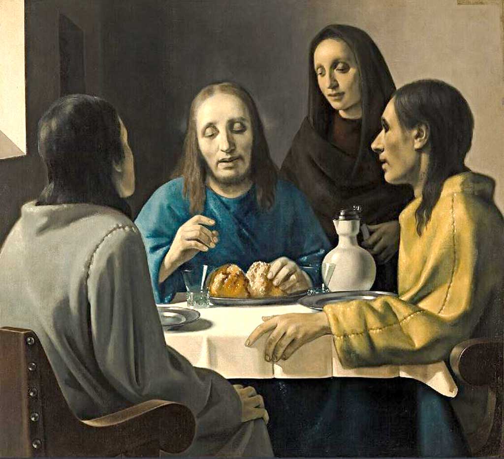 Odkrycie. We wrześniu 1937 roku do mieszkającego w Monaco, sędziwego już dra Abrahama Brediusa, przybywa z Francji prawnik Gerard Boon z obrazem pt. „Jezus i uczniowie w Emmaus”, który, jak twierdzi, jest dziełem Vermeera. Boon przedstawia się jako powiernik majątku starej holenderskiej rodziny, która chce spieniężyć obraz, i prosi o ekspertyzę. Obraz zdecydowanie jest stary, jak prawie wszystkie dzieła Vermeera nie jest datowany, wymaga jednak szczegółowych oględzin i analiz. Wkrótce dr Bredius publikuje artykuł, przypisując sobie odkrycie „arcydzieła” łączącego dojrzałe malarstwo Vermeera z jego wczesnym, nieznanym do tej pory, „religijnym” okresem twórczości. Pisze: „To arcydzieło jest tak różne od innych dzieł Vermeera, a jednak w każdym calu Jego (…) W żadnym innym obrazie Mistrza nie znajdziemy tak głębokiego zrozumienia opowieści biblijnej i poprzez medium, jakim jest sztuka najwyższej miary, tak emocjonalnie opowiedzianej”. Opinia dr Brediusa sama w sobie jest niczym biblijny przekaz, wtórują mu więc wkrótce inni eksperci w stylu: „Taki Vermeer to jak symfonia Beethovena z Raju…”