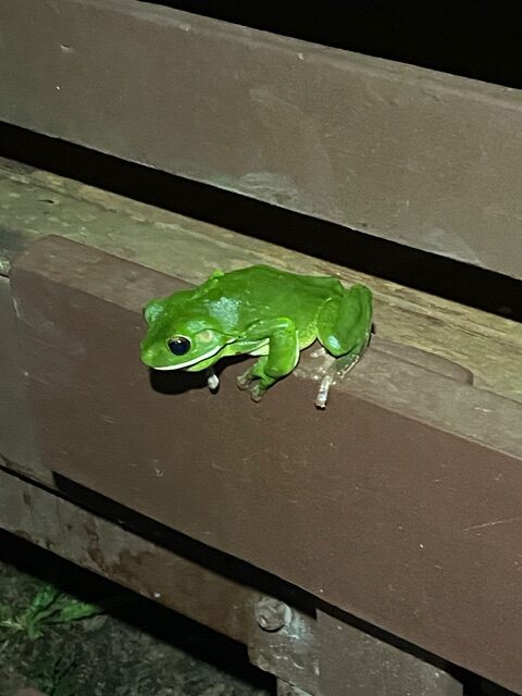 Gdy budzę się w nocy, robię notatki, potem zasypiam nad ranem. W tym miejscu, w toalecie, po raz pierwszy spotykam wielką żabę. Ropucha siedzi na otwartym sedesie, zupełnie nie poruszona moim wejściem. Przez chwilę myślę: pocałuję, może… Jednak ustępuję miejsca w ustępie. Idę do kabiny obok. We wszystkich leśnych toaletach (bush toilets) są napisy z prośbą o zamykanie klap. Inaczej nie wiadomo co spotkasz w sedesie? Żabę czy księcia z bajki?