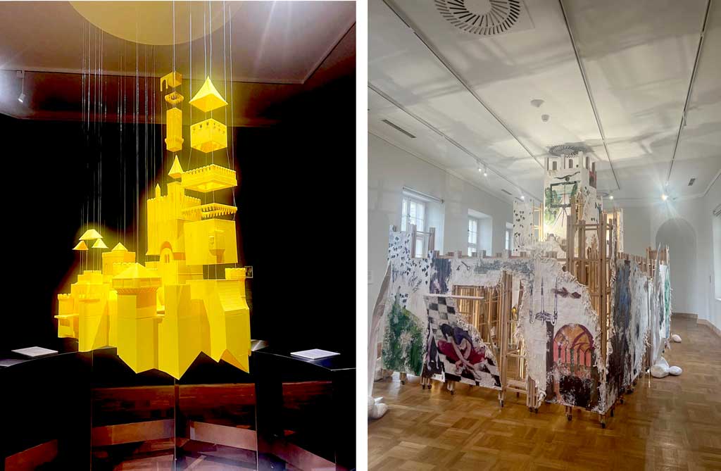 Instalacja “Ostatni zamek” których elementy (szczególnie lekka, ażurowa konstrukcja Turnusu) stanowią świetną pointę. Odarty z „ciężaru znaczeniowego”, zamek okazuje się być konstrukcją kruchą, niemal efemeryczną. Żółty model wiszący na żyłkach idealnie ilustruje „zamczystość” jako zestaw luźnych klocków, które możemy dowolnie składać, zawieszać w próżni i dekonstruować.